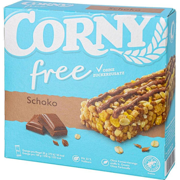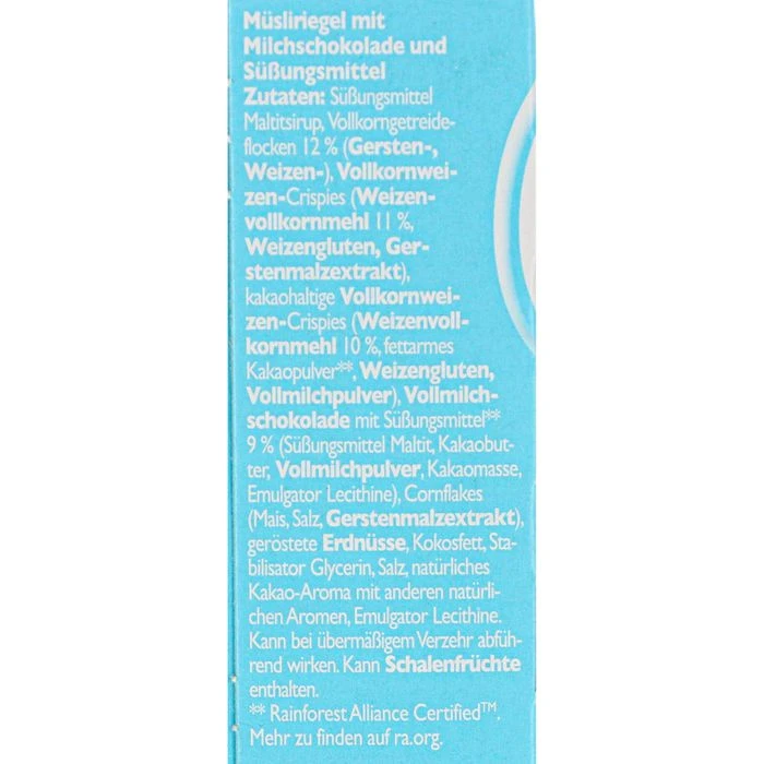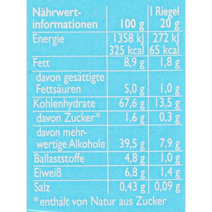 Zutaten: Süßungsmittel Maltitsirup, Vollkorngetreideflocken 12% (GERSTEN-, WEIZEN-), VOLLKORNWEIZEN-Crispies (WEIZENVOLLKORN-MEHL 11%, WEIZENGLUTEN, GERSTENMALZEXTRAKT), kakaohaltige VOLLKORN-WEIZEN-Crispies (WEIZENVOLLKORNMEHL 10%, fettarmes Kakaopulver, WEIZENGLUTEN, VOLLMILCHPULVER), VOLLMILCHSCHOKOLADE mit Süßungsmittel 9% (Süßungsmittel Maltit, Kakaobutter, VOLLMILCHPULVER, Kakaomasse, Emulgator Lecithine), Cornflakes (Mais, Salz, GERSTENMALZEXTRAKT), geröstete ERDNÜSSE, Kokosfett, Stabilisator Glycerin, Salz, natürliches Kakao-Aroma mit anderen natürlichen Aromen, Emulgator Lecithine