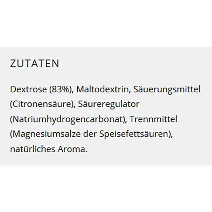 Dextrose (83%), Maltodextrin, Säuerungsmittel (Citronensäure), Säureregulator (Natriumhydrogencarbonat), Trennmittel (Magnesiumsalze der Speisefettsäuren), natürliches Aroma