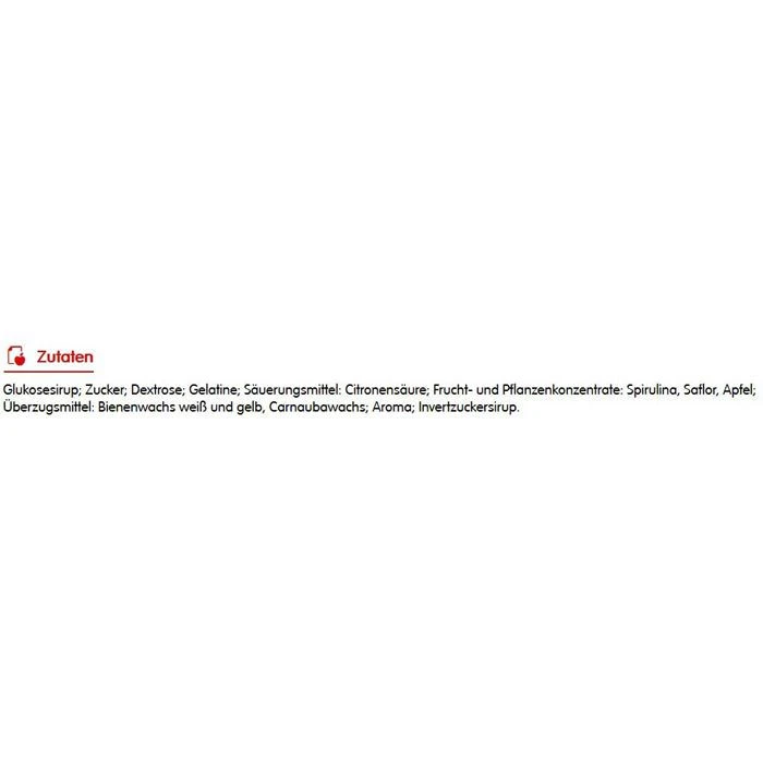 Glukosesirup, Zucker, Dextrose, Gelatine, Säuerungsmittel: Citronensäure, Frucht- und Pflanzenkonzentrate: Spirulina, Saflor, Apfel, Überzugsmittel: Bienenwachs weiß und gelb, Carnaubawachs, Aroma, Invertzuckersirup