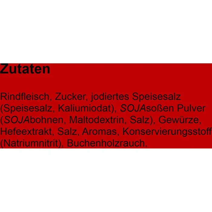 Rindfleisch, Zucker, jodiertes Speisesalz (Speisesalz, Kaliumiodat), SOJAsoßen Pulver (SOJAbohnen, Maltodextrin, Salz), Gewürze, Hefeextrakt, Salz, Aromas, Konservierungsstoff (Natriumnitrit), Buchenholzrauch.