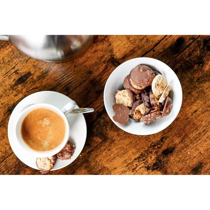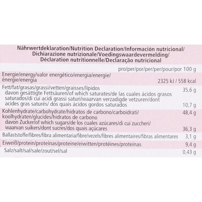 Zutaten: Zucker, 23% MANDELN, Glukosesirup, Palmfett, 6% HASELNÜSSE, Kakaomasse, Kakaobutter, MAGERMILCHPULVER, SÜßMOLKENPULVER, VOLLMILCHPULVER, BUTTERREINFETT, Emulgator: Lecithine (enthält SOJA); natürliches Aroma.