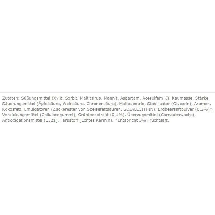 Süßungsmittel (Xylit, Sorbit, Maltitsirup, Mannit, Aspartam, Acesulfam K), Kaumasse, Stärke, Säuerungsmittel (Äpfelsäure, Weinsäure, Zitronensäure), Maltodextrin, Stabilisator (Glycerin), Aromen, Kokosfett, Emulgatoren (Zuckerester von Speisefettsäuren, SOJALECITHIN), Erdbeersaftpulver (0,2%)*, Verdickungsmittel (Cellulosegummi), Grünteeextrakt (0,1%), Überzugsmittel (Carnaubawachs), Antioxidationsmittel (E321), Farbstoff (Echtes Karmin)