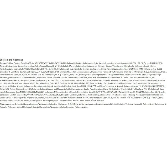 1. Lion: Zutaten: Getreide (38,9% VOLLKORNWEIZENMEHL, WEIZENMEHL, Reismehl), Zucker, Glukosesirup, 6,3% Karamellcreme (gezuckerte Kondensmilch [VOLLMILCH, Zucker, MILCHZUCKER], Zucker, Glukosesirup, Karamellzuckersirup, Salz), Sonnenblumenöl, 4,1% Schokolade (Zucker, Kakaopulver, Kakaomasse, fettarmer Kakao), Vitamine und Mineralstoffe (Calciumcarbonat, Niacin, Pantothensäure, Eisen, Vit. D, Vit B6, Thiamin [Vit. B1], Riboflavin [Vit. B2], Folsäure), Salz, natürliche Aromen, Emulgator Lecithine, Karamellzuckersirup.#Kann ERDNÜSSE, MANDELN und andere NÜSSE enthalten. 2. Cini Minis: Zutaten: Getreide (32,5% VOLLKORNWEIZENMEHL, Reismehl), Zucker, Sonnenblumenöl, Glukosesirup, Maltodextrin, Maisstärke, Vitamine und Mineralstoffe (Calciumcarbonat, Niacin, Pantothensäure, Eisen, Vit. D, Vit. B6, Thiamin [Vit. B1], Riboflavin [Vit. B2], Folsäure), Salz, Zimt, Säureregulator Natriumphosphate, Emulgator Lecithine, Antioxidationsmittel (stark tocopherolhaltige Extrakte), geröstetes GERSTENMALZEXTRAKT, natürliches Aroma, Farbstoff Annatto.#Kann MILCH, ERDNÜSSE, MANDELN und andere NÜSSE enthalten. 3. Cookie Crisp: Zutaten: Getreide (35% VOLLKORNWEIZENMEHL, Maisgrieß), Zucker, Glukosesirup, WEIZENSTÄRKE, 3% Schoko-Keks-Stückchen (WEIZENMEHL, Puderzucker, Kakaopulver, Sonnenblumenöl, Maisstärke), Vitamine und Mineralstoffe (Calciumcarbonat, Niacin, Pantothensäure, Eisen, Vit.D, Folsäure, Vit.B6, Riboflavin [Vit.B2]), Sonnenblumenöl, fettarmer Kakao, Salz, Melasse, natürliches Aroma, Backtriebmittel Natriumcarbonate, Säureregulator Kaliumphosphate. Kann MILCH, ERDNÜSSE, MANDELN und andere NÜSSE enthalten. 4. Nesquik: Zutaten: Getreide (51,4% VOLLKORNWEIZENMEHL, Maisgrieß), Zucker, Glukosesirup, 5,7% fettarmer Kakao, Vitamine und Mineralstoffe (Calciumcarbonat, Niacin, Pantothensäure, Eisen, Vit. D, Vit. B6, Thiamin [Vit. B1], Riboflavin [Vit. B2], Folsäure), Salz, natürliches Aroma.#Kann MILCH, ERDNÜSSE, MANDELN und andere NÜSSE enthalten. 5. Nesquik Duo: Zutaten: Getreide (47,9%
