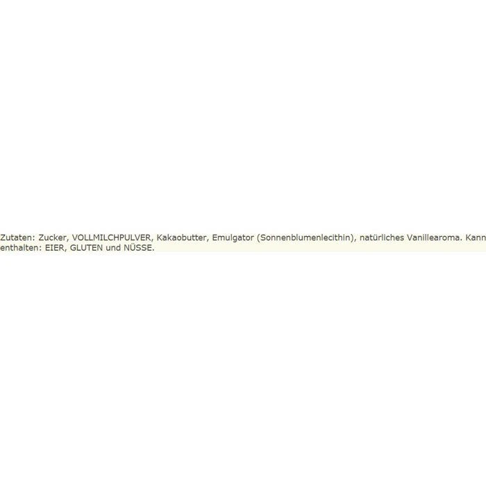 Zutaten: Zucker, VOLLMILCHPULVER, Kakaobutter, Emulgator Lecithine, natürliches Vanillearoma.