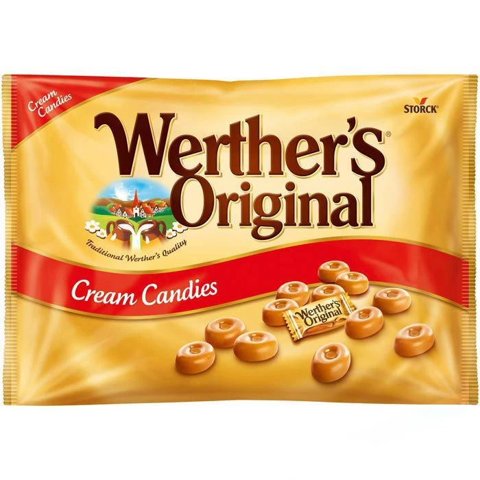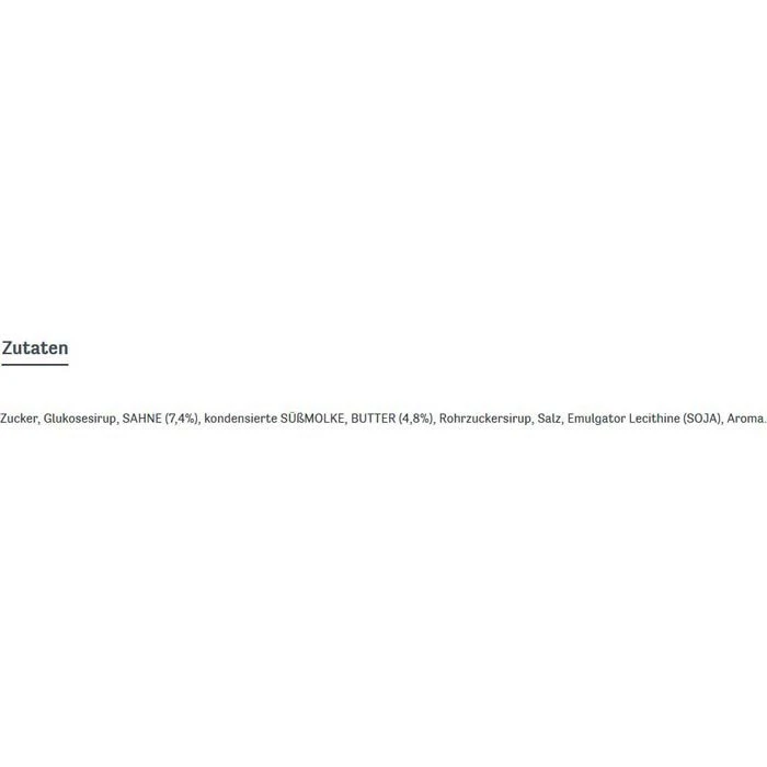 Zutaten: Zucker, Glukosesirup, SAHNE (7,4%), kondensierte SÜSSMOLKE, BUTTER(4,8%), Rohrzuckersirup, Salz, Emulgator Lecithine (SOJA), Aroma